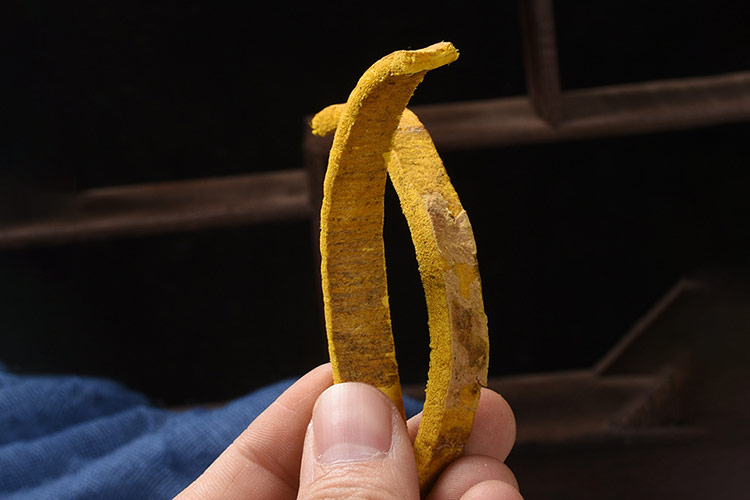 Huang Bo is plate-shaped or shallow groove-shaped, with different lengths and widths, and a thickness of 1-6mm. The outer surface is yellowish brown or yellowish brown, flat or with longitudinal grooves, and some visible lenticels and residual taupe rough skin; the inner surface is dark yellow or light brown, with fine longitudinal ribs. Light in body, hard in quality, fibrous in cross-section, layered in lobes, dark yellow. Slight gas, extremely bitter taste, sticky when chewed.