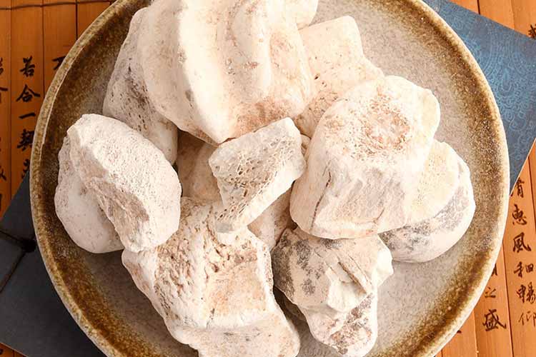 Also known as Bai Long Gu, it is similar in shape to animal bones but thicker and larger in size. The surface is grayish-white or yellowish-white and usually smooth, with some having textures and cracks or brown stripes and spots. It is hard in quality, and the fracture surface is uneven, white, and fine like powder. There are small honeycomb-shaped pores in the joint area. It also has strong moisture-absorbing ability and is odorless and tasteless. The best quality is the one that is hard in texture, white in color, and has strong moisture-absorbing ability.